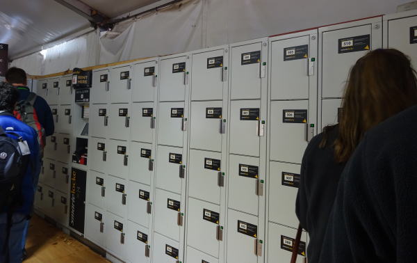 | 島に入り順路を進みビジターセンターでチケット・パスポートを提示するとリストテープを付けてくれる。 クラウン(冠部分)へ上がるのには、カメラ・薬・メガネ以外は持ち込み禁止で入口のコインロッカー(3j)に荷物を預ける。モニターにロッカー番号と自分の指紋を記録させ、開ける時も同じ手順で開けるという指紋認証式のコインロッカー。 |