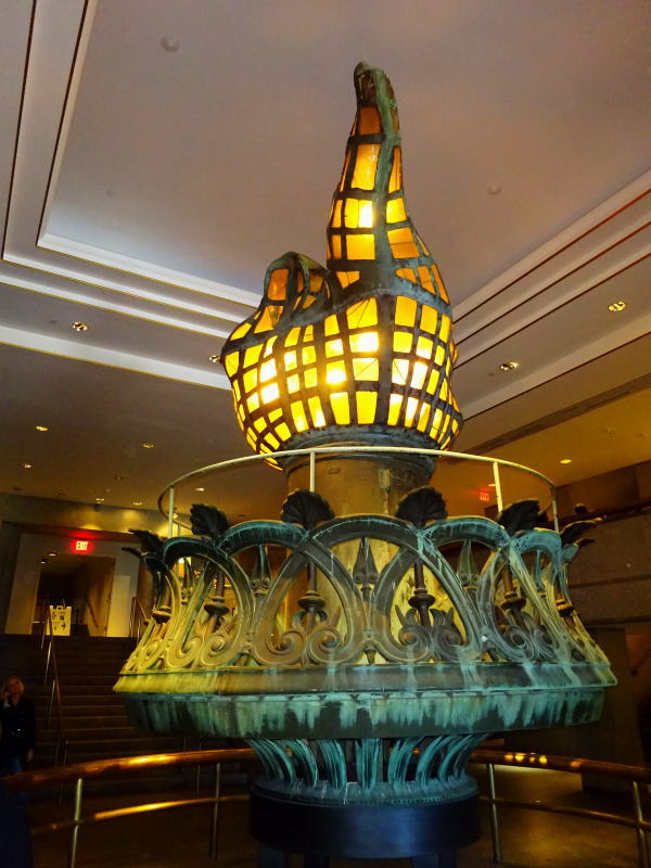 台座の実物大のトーチの先の階段は自由の女神クラウン(冠部分)入場者だけが通れる、354段の急勾配の階段を登りはじめる。 |