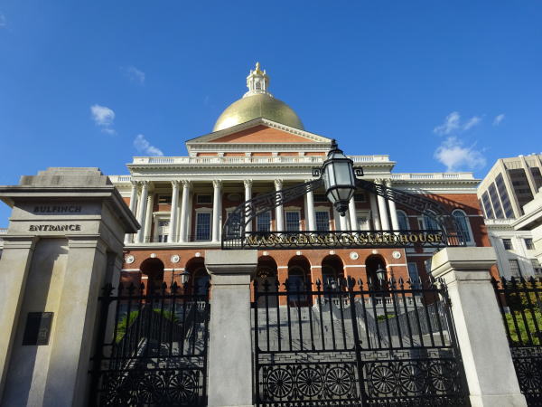 金色に輝くドームを持つマサチューセッツ州議事堂。ボストンのランドマークのひとつで正面のブロンズ像の中に、第35代大統領ジョン F. ケネディの像もある。 |