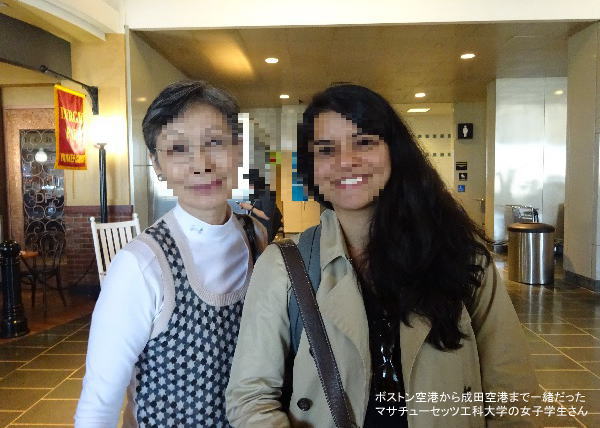 ボストン空港に着いてJALカウンターで搭乗手続きのとき列の前に並んだマサチュウセッツ工科大学の学生さんと仲良くなる。ずっと成田まで一緒で成田ではJRの乗り場を案内してあげる。成田空港で荷物が出てこなく係りの人が探してくれやっと出てきたトランクは検査の為開けられた様子。中身は問題なかったが気持ち悪い初めての経験だった。