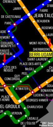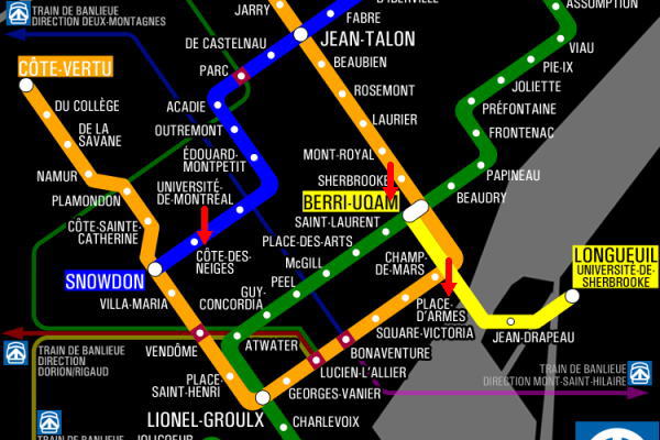 地下鉄のオレンジラインBERRI-UQAM駅から3っ目のヒルトンホテル最寄り駅PLACE-DARMES駅へ。 |