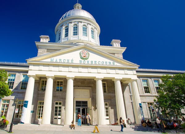 ノートルダム大聖堂からセントローレンズ川の旧港沿いを歩く。銀色のドーム屋根のボンスクール・マーケットは市庁舎やパブリックマーケットなど時代ごとにいろいろな役割を担ってきた。 |