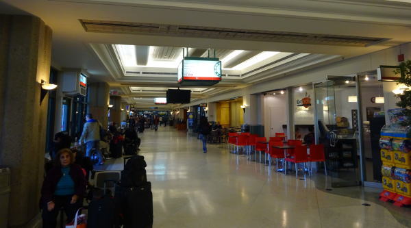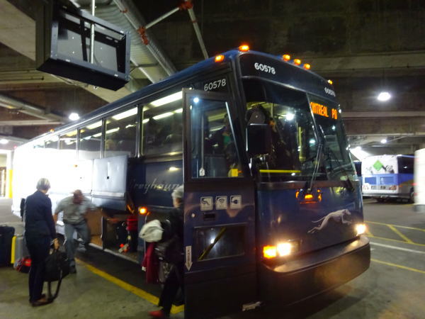 ホテルから20分程歩いてオタワのバスターミナルへ。グレイハウンド.バス モントリオール行は1番Gate。写真右側の一人だけ前に並んだ奥さんに話しかけると、日本に来たことがある方で、東京〜大阪〜京都など回ったそうで日本は全て素晴らしいと絶賛され嬉しかった。その方とは車中でも前後の席になる。 |