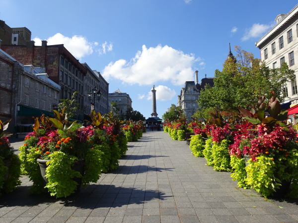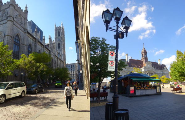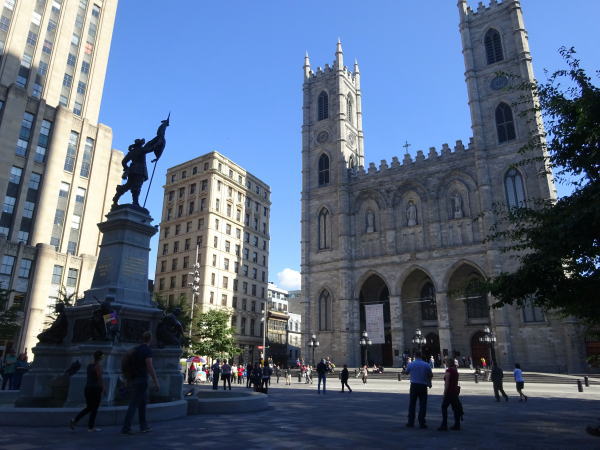 ホテル前の大通りから右の坂道を上がるとノートルダム大聖堂前に出る。映画タイタニックの主題歌を歌ったセリーヌ・ディオンはこの街の郊外で生まれこの教会で結婚式を挙げた。 |