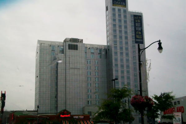 バスターミナルに着きタクシーを降りるとその辺は雨の降った気配が全くない。よく考えると、ホテルの外の霧雨と思ったのはナイアガラの滝で勢いよく流れ落ちる時舞い上がる水しぶきのようで、ホテル一帯に降り注いでいるものとわかった。 |