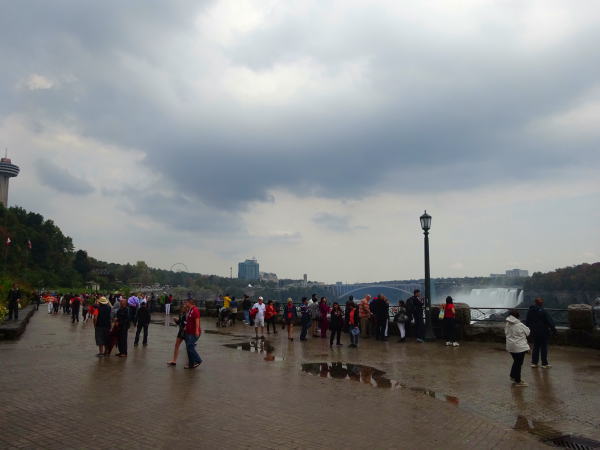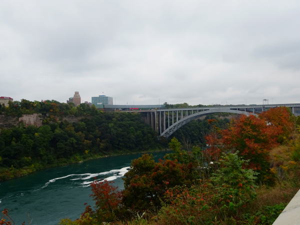 しばらく歩道を歩くと国境のレインボーブリッジが見え始める。明日バスでアメリカに陸路入国する時はこの橋を渡っていくのだろうか。その先にアメリカ滝が見える。ホテル近くのテーブルロックから見るよりは滝の迫力がある。むしろずっと向こうに見えるカナダ滝より豪快で、見る位置で両方の滝の迫力が違いがわかってよかった。 |