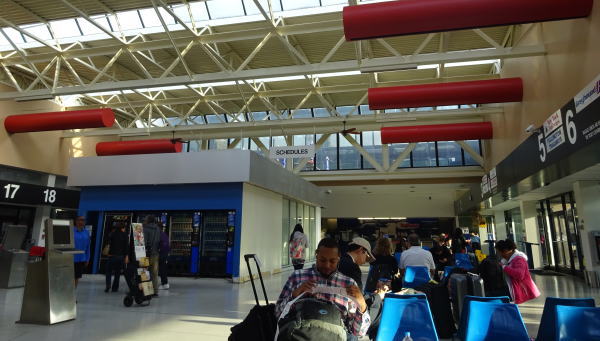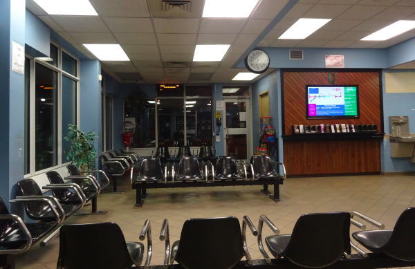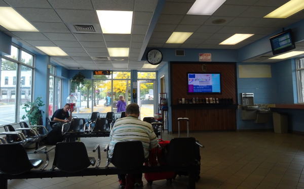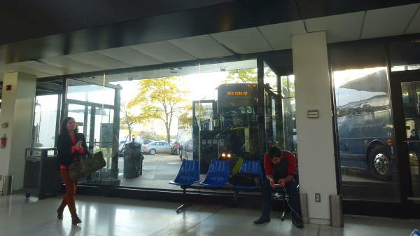 鉄道駅向かいがバスターミナルで、明日バッファロー空港へ行くバスが通るはず。 駅員さんに7:05分のバッファロー空港行きバスの発着ゲイトと時間を確認する。 これで一安心。 |