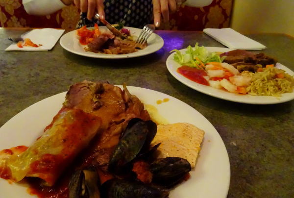 17時頃おきてカジノの中にあるレストランへ。夕食は@22jのヴッフェ。質より量で品数は豊富だが味は今一だった。 |