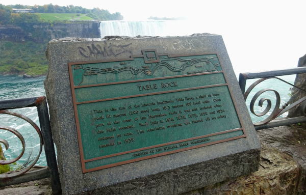 カジノの中を通りスカイロンタワーを左に見ながら坂道を下るとテーブルロックという滝の前展望台があるヴィクトリア公園の遊歩道をカナダ滝方面に歩く。轟音をあげ流れ落ちる滝はその勢いでしぶきを舞い上げて霧のように遊歩道に降りそそいで傘をさして歩く人もいた。ここも傍若無人に振舞う中国人の観光客の多いのには驚くばかり。 |