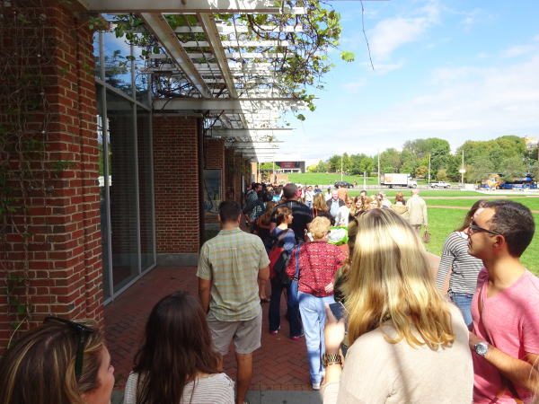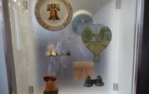 独立記念館前にあるリバティベルセンター前はベルを見学する人で長い行列。30分以上待って入場見学する。 |