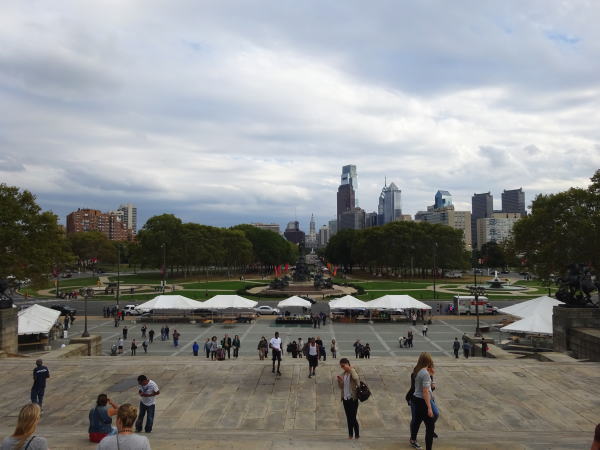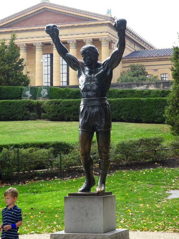 美術館前広場から右側の坂道を下ると映画『ロッキー』の最後の場面に登場するモニュメントがある。像の前に並んで記念写真を撮る人で行列ができていた。 |