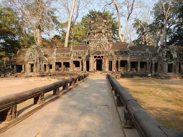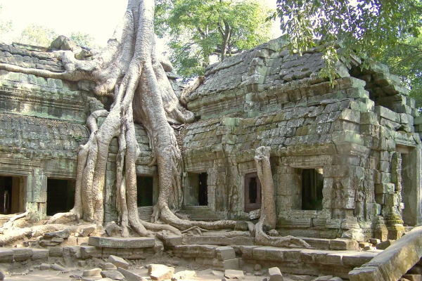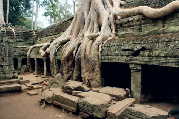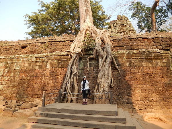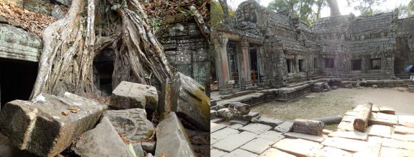 タプローム遺跡はカジュマルによる侵食が激しく、樹木が遺跡に飲み込みかけている。タプローム遺跡の保存にはインド政府が修復を担当していて、修復計画について議論が沸き起こっている。巨大な樹木は移籍を破壊しているのか、遺跡を支えているのかという議論らしいが、ユネスコを中心とした修復方針の結論はでないでいる。 が、この圧倒的な迫力で迫ってくる景観をは絶対に残して欲しいものである。 |