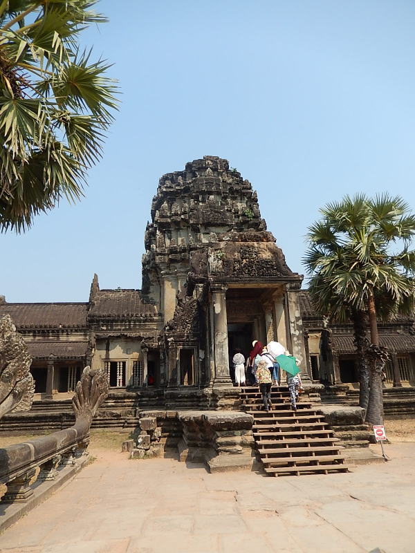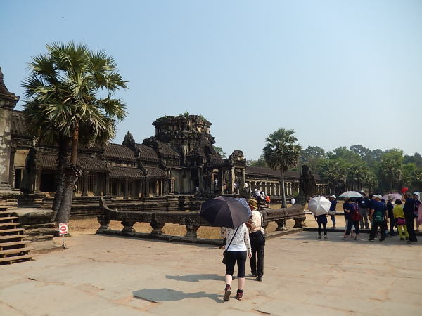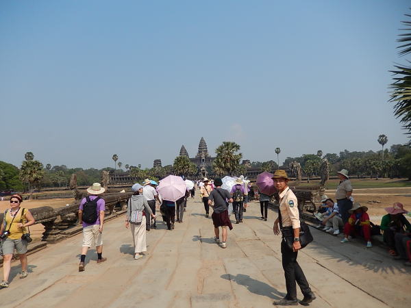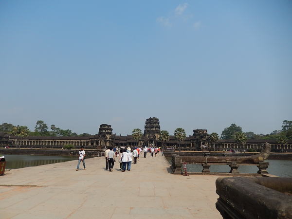 アンコールワット表参道を進む。ガイドさんのカンボジア青年はたどたどしい日本語での案内だったが、一度も日本に来たことがなくカンボジアで勉強しただけにしては上手で感心する。 |