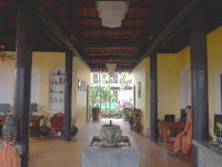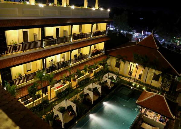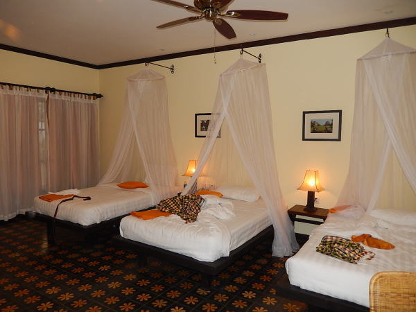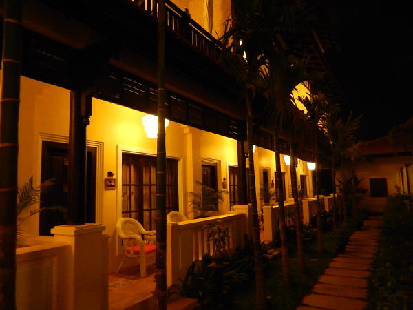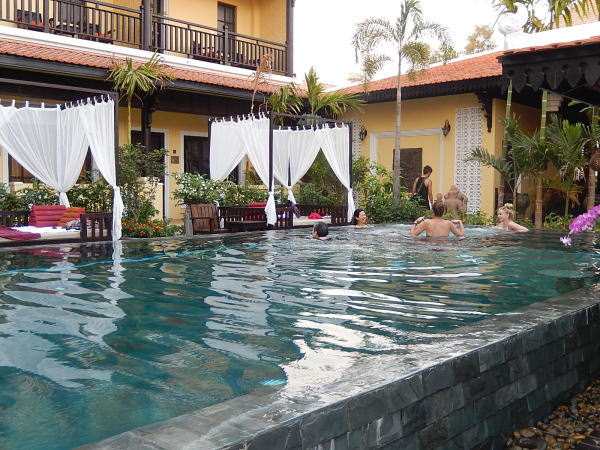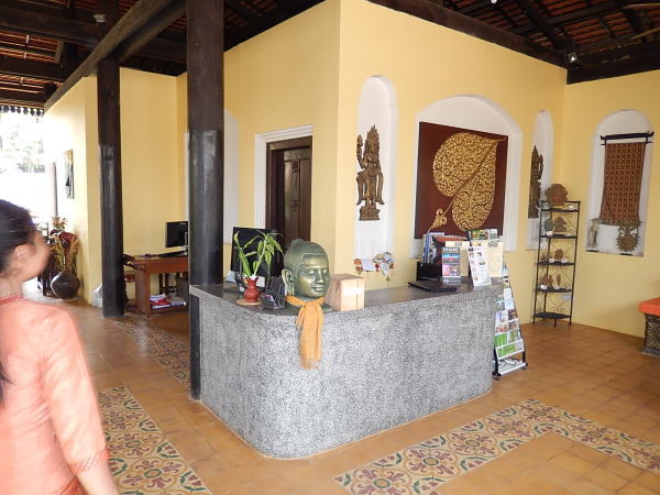 空港から約20分位でホテルに到着。 長い民族衣装のフロントクラークの女性が両手を合わせスオスダイ(こんにちは)と笑顔で迎えてくれる。 チェックイン。 ホテルは風情もありとてもきれいで、部屋は一階奥の3人部屋、プール脇通路を進んで正面の部屋。 |