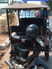 予約したホテルの出迎えを見つけ案内に従いついていくと、車かと思っていたがツゥクツゥクだった。 風を切って走るツゥクツゥクは気持ちいい、約20分でホテルへ到着。 チップ1㌦。カンボジアはUS㌦が流通していて両替は不要と事前の情報通りだった。 |