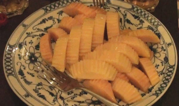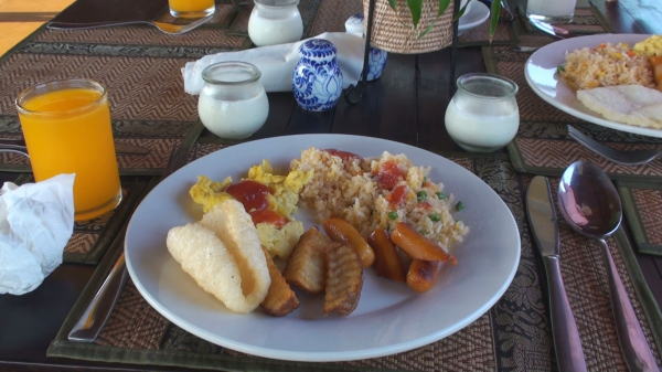 今夜の夕飯はマンゴー・パン・カップ麺となった。ナイフがないのでフロントに電話して4個のマンゴーをむいてもらう。すぐにカットして大皿に盛り付けて持ってきてくれた。感動するくらい甘くて美味しかった。 |
