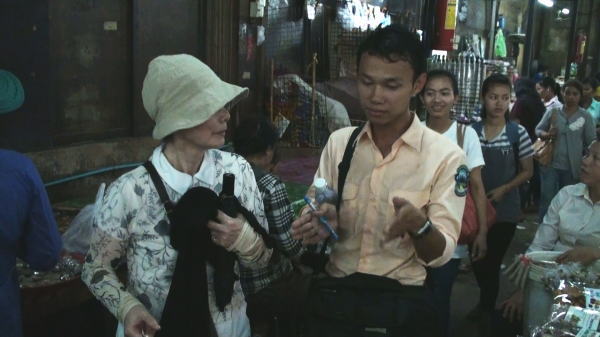 オールドマーケット近くでトゥクトゥクを止め降りると、向かいのホテルからアンコールワットで別れたガイド青年が出てくる。先ほどの同行者達を送ってきたという。こんなところで再会できるなんて!嬉しかった。 |