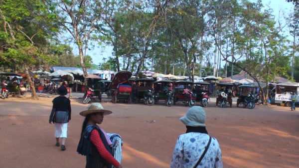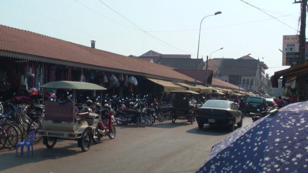 アンコール遺跡群見学を終えた後、待たせていた、おじさんのツゥクツゥクで市内に戻る マンゴーを食べたいと二人の希望でオールドマーケットへ。 |
