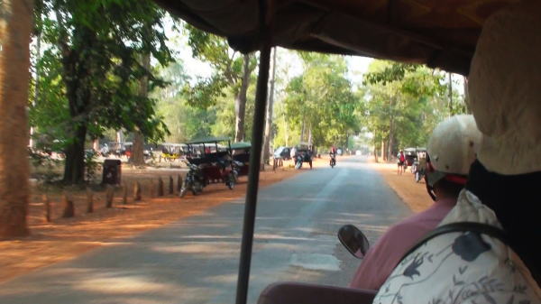 この観光ツアーにはタプロームが含まれていないのでアンコールワット観光途中姉がどうしてもタプロームをどうしても見たいと「わがまま」をいい始めて、時計を見ると15:30。アンコール遺跡は17時閉門なので考えた挙句ツアーをここで離れタプロームに行くことにして大急ぎ表参道を戻り 、沢山待機中のツゥクツゥクの一つに声をかける。タプローム~観光後~オールドマーケットまでの値段交渉だ。最初の運転者はどこかの専属らしく他の人に声をかけ呼ぶ。少し人相の悪そうな人。言い値は15㌦で3人30㌦といってくる。「NO!12㌦」というと拒否するのですぐにほかをあたろうと去りかけると「OK」と返事。ずいぶん簡単に値を下げるものだがラッキーと思いながら姉とMを促して乗車する。 おじさんのバイクは旧式なのかふかしてもなかなかスピードが上がらず後続の車が追い越していく。言い値で言ってくれてるのだから我慢しよう。約20分程両側緑の舗装路を走りタプローム入口に到着。人相の悪いおじさんドライバーに1時間待ってもらうので半分支払おうとすると後でいいと人のいいことをいう。 |