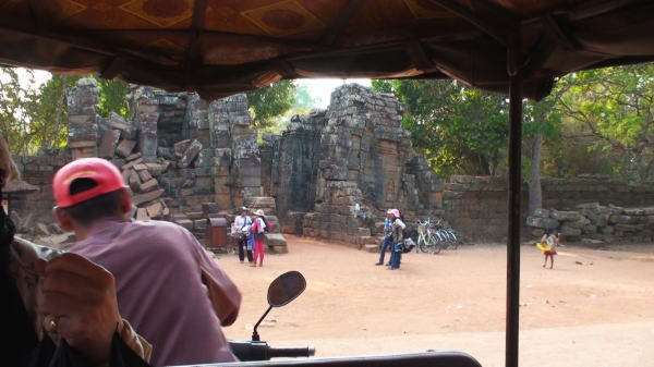 おじさんのバイクは旧式なのかふかしてもなかなかスピードが上がらず後続の車が追い越していく。言い値で言ってくれてるのだから我慢しよう。約20分程両側緑の舗装路を走りタプローム入口に到着。人相の悪いおじさんドライバーに1時間待ってもらうので半分支払おうとすると後でいいという。いっぺんにおじさんが好きなる。 |