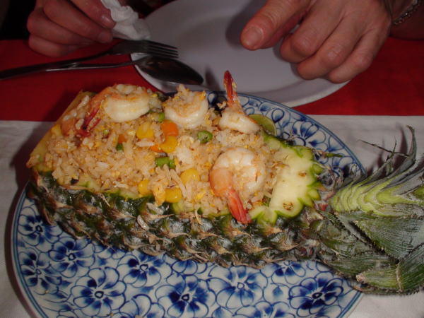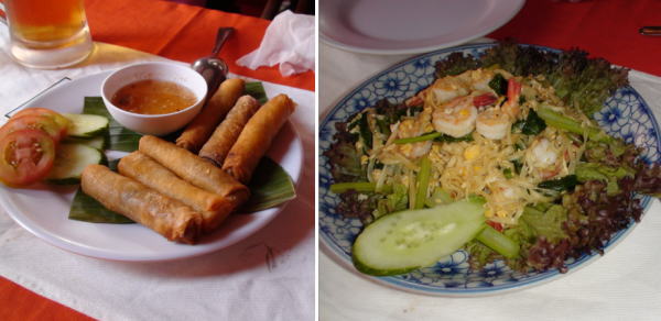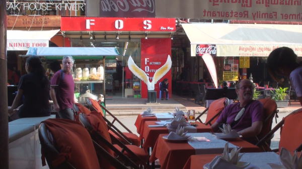 | 映画トゥームレイダー主演のアンジェリーナ・ジョリーが滞在中頻繁に通ったというパブストリートの「RED PIANO」も見るが近くのレストランに入り カンボジアで初めての食事をする。春巻き・チャーハン・めん料理を注文。ビールは苦味が少なくあっさり目の味。料理はあま辛い味でなじめない味だが、ゆっくりカンボジアを味わいながら食べる。うまいまずいは関係ない、それが旅なのだから。 |