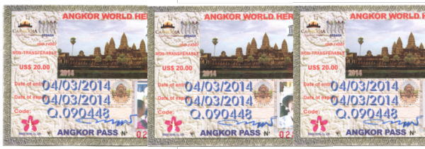 Angkor Thom Angkor Watの1日入場券20㌦3日券は40㌦で一日券を購入する。窓口で入場料を支払いカメラに視線をあわせるよう促され写真を撮られて、その後僅か数分後、ガイドさんから写真入りの入場券を渡される。 すごい早業。 |
