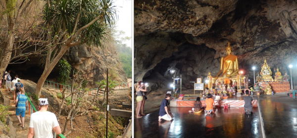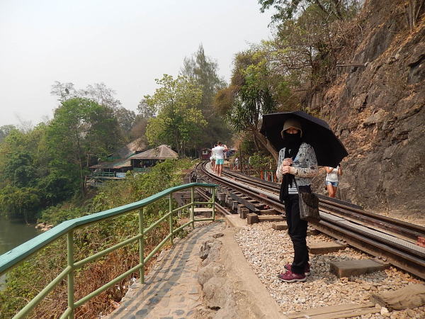 タムカセ(Tham Krasae)駅で下車して線路上を歩いて洞窟の仏像を見学。 日焼け防止に海賊スタイルで。 |