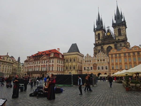 細い坂の小道をくだり信号を渡ると石畳の旧市街に入る。すぐのところのスヴォルノスティ広場で若者が路上ライブ中でカントリーを見事な歌唱でベンチに座り聞きながら小銭を帽子に入れて行く。 |