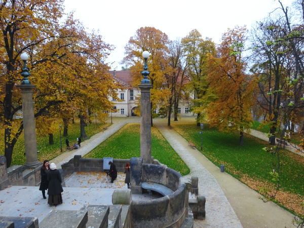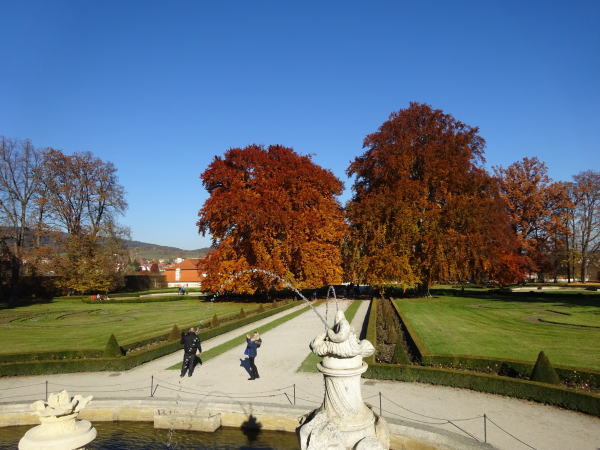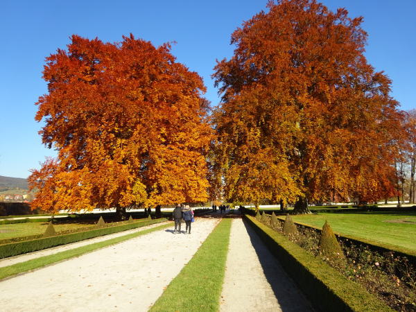 さらに進むと城の庭園に出る。秋に色づいた大木が青空の下に輝いている。 |