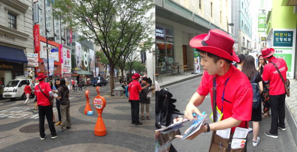 | 明洞の町にはいたるところに赤い帽子の日本語など観光ガイドさんがいて親切に相談にのってくれる。なかなかのいい心のこもったサービスだ。 | ||||||||||||||||||||||||||||||||||||||||||||||||
