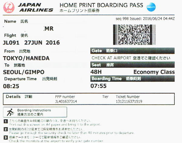 112番ゲートから午前8時搭乗開始、機内へ。28HK席は2人席。羽田からソウルまでは僅か2時間20分の飛行で日本国内のよう。 |