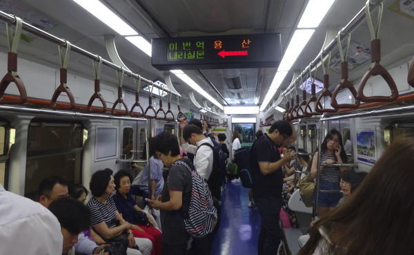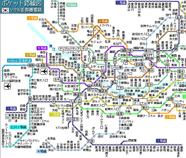 地下鉄9号線に乗り鷺梁津駅で1号線に乗り換え鐘閣駅へ行きたいが、上り下りどっちか分からない。若者をつかまえ尋ねるが、お互い言葉が全く解らないが、路線図見せると先のホームまで案内してくれる。なかなか韓国青年は親切である。 |
