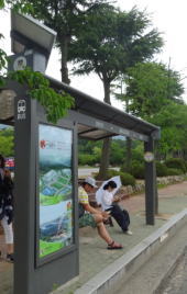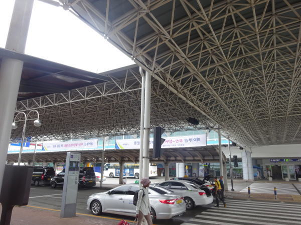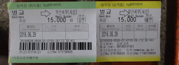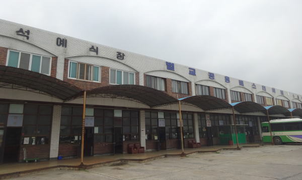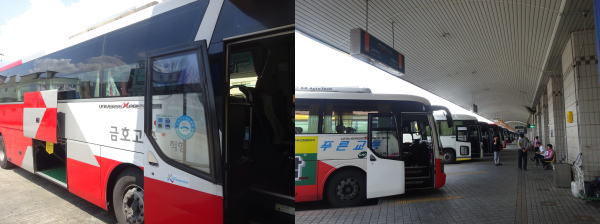 筏橋バスターミナルはすごい古風な建物で年代を感ずる。チケット売場は日本語は勿論英語も全くl通じない。ガイドブックの釜山(부산)のハングル文字を指さしてなんとか購入。