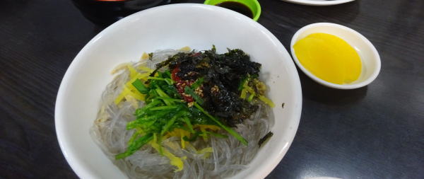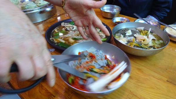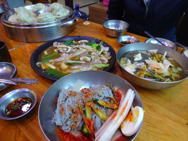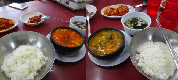 次に入った食堂では言葉やメニューが全てハングルで分からず隣のテーブルの女性グループが食べているものと同じものを注文する。
