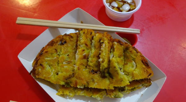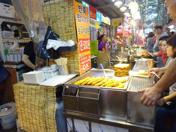 なかなか活気のある市場で大阪の黒門市場を規模を大きくしたような雰囲気。行列の店でお好み焼きを揚げたようなものを食べる。さつま揚げとお好み焼きをミックスしたような感じでなかなかおいしい。