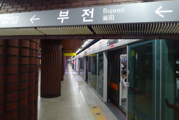 地下鉄南浦駅から釜田駅は乗り換えなしで行ける。ここで近くの鉄道駅から慶州方面の電車に乗る。