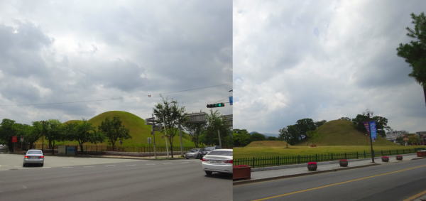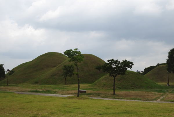 | こんもり具合。きれいに刈り揃えられた芝生が古墳を暖かく包んでいます。古墳の向こうには、また古墳。続いて古墳。そして古墳。またまた古墳。大陵苑のような古墳公園だけでなく、慶州市内にはこのような景色がごくありふれて転がっているのです。