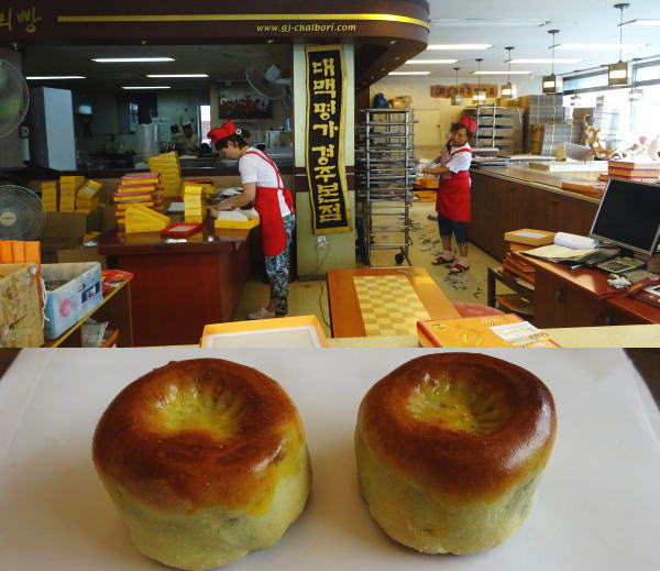 皇南パンは慶州でしか買うことができないプレミア感がある(最近ソウルロッテワールド店がオープン)たまたまの縁か慶州駅からバスターミナルに歩いている最中、本店の前を偶然通ったのだからと、休憩もかねて店に入り腰かけて一個60㌆を試食させてもらう、とても美味しい。正にあんこ入りの薄皮まんじゅう。20個箱入りをお土産に購入(12000㌆)