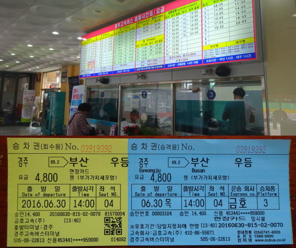 慶州バスターミナル13:30で釜山までの高速バスチケット購入4800x3=13600㌆(\1300)