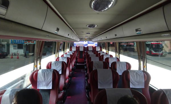 釜山バスターミナル14:00発に乗車 3人料金13600㌆(\1300)の安さ。