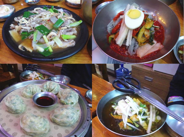 写真入りメニューで説明を受けながらレストランご主人手打ちという、店名でもある元山冷麺(ウォンサンメンオク)興冷麺、牛肉煮込鍋、餃子か小籠包のようなもの、など注文。