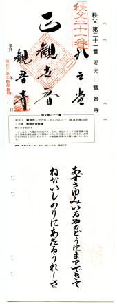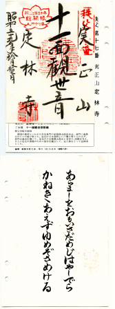 | ■ 札所二十番 法王山 岩之上堂 (ほうおうさん いわのうえどう) 【物語】 昔は、願上寺といわれ大伽藍の寺であったが、永禄の兵乱により焼かれ、御本尊は仮堂に安置されていた。その後、この村の打田武左衛門慰政勝によって観音堂が建てられた。 【記事】 藤原時代の作といわれている本尊の聖観音像を安置する宮殿形の厨子は、観音開きの扉の裏面に、日天、月天、風神、雷神と共に極彩色で三十三観音の彫刻がある。 【ひと言】 二十番岩之上堂は、ショカッサイ(大根の花)や、サルビアの咲く頃に行くと良い。 参道の両側は、ショカッサイの淡い紫の花やサルビアで、真紅に埋って見事である。境内は四季折々の花が植えられて、荒川を前にした静かな霊場である。また、札所唯一、開設以来の番付と所在地を保持する札所である。 【御詠歌】苔むしろしきてもとまれ岩の上玉のうてなも朽ちはつる身を 【所在地】〒368‐0056 埼玉県秩父市大字寺尾2169(内田) 【電話番号】0494‐23‐9419 出典:CANON ELECTONICS INC編纂より |