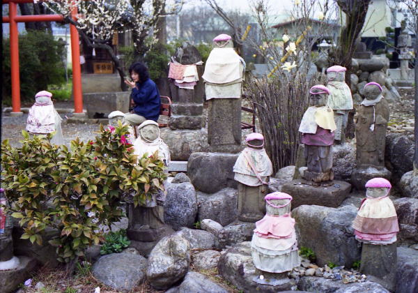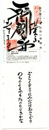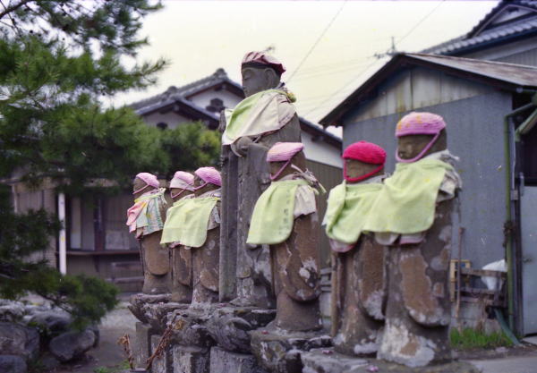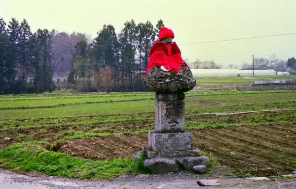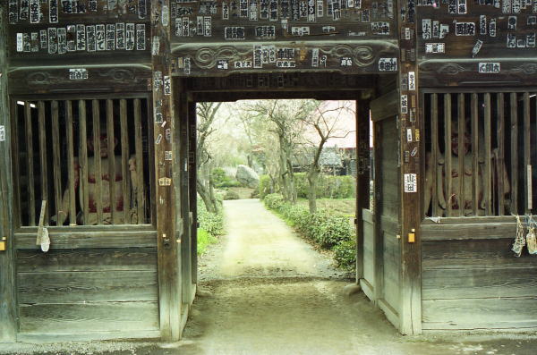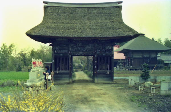 昭和60年4月10日秩父三十四ヶ所 4回目巡拝 22番・栄福寺 山門前にぽつんと赤で着飾ったお地蔵さん、歴史を感ずる山門をこぐると本堂と庫裏が並んで納経は近所の農家の奥さん方が交代で受けていて、道も庭もとても綺麗にされていて感心する。 菜の花の漬物、お茶の接待を受ける。 |