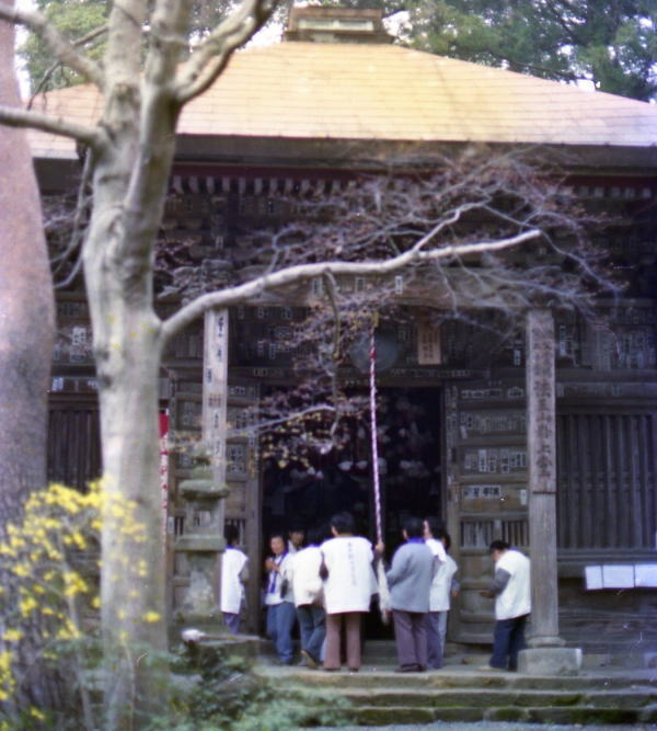 昭和60年4月10日 19番・竜石寺から左手に武甲山を仰ぎながら20分で今日2っ目の20番・岩上堂。Mは20人くらいの団体遍路さんと一緒に般若心経唱和する。 |