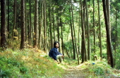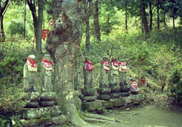 昭和60年4月10日秩父三十四ヶ所 4回目巡拝 音楽寺から下りの山道はそこらじゅうのシイタケの栽培をみながら今日6っ目の24番・法泉寺へゆっくり歩いて40分。 杉林に両側を囲まれた217段の長い石段を登りきるとこじんまりした本堂、左手には六地蔵が並ぶ。 |