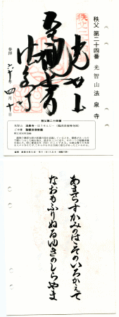 | ■ 札所二十四番 光智山 法泉寺 (こうちさん ほうせんじ) 【物語】 昔々、武蔵国の恋ヶ窪に、口中の腫れ物に苦しむ遊女が居た。 遊女は観音を信仰する大変慈悲深い女性で、毎朝修行僧に施しをしていたという。そんなある朝、秩父から来たという僧が、一本の楊(やなぎ)の枝を遊女に与え、「この枝で口の中をそそぎなさい」と教えた。 遊女は、僧の教えどおりに楊の枝で口中をそそいでみる事にした。すると、口中の腫れ物はみるみるうちに快癒し、痛みも全て消えてしまった。 以来、この寺には病の回復を願う礼拝者も多いという。 【記事】 毎年4月18日の縁日の日には地元の人々が集い、廻り念仏が行われる。 廻り念仏は、境内に集まった人々が輪になって座り、念仏を唱えながら大数珠(約10メートル)を隣の人に廻していくものである。そのため、大数珠廻しとも呼ばれている。大数珠は、本堂の右側に吊るしてあり、参詣者が手に触れることができる。 【ひと言】 116段の石段を登りきった境内からは、田園風景と共に、秩父のシンボルである武甲山を望む事ができる。子供の頃境内で遊んだ記憶が目前に甦ってくるような、そんな懐かしさ溢れる風情である。 【御詠歌】 天照す神の母祖の色かへてなおもふりぬる雪の白山 【所在地】 〒368-0054 埼玉県秩父市別所1568 【電話番号】 0494-23-0943 出典:CANON ELECTONICS INC編纂より |