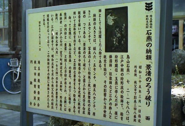 | ■ 札所二十六番 万松山 円融寺 (ばんしょうざん えんゆうじ) 【物語】 その昔、弘法大師がこの地に巡錫(じゅんしゃく)し、21日間に及ぶ護摩(ごま)の修行を成し遂げると、そこに観世音が現れて「この事後の大徳に任せよ」と告げた。その後、巡錫に訪れた恵心僧都は、聖観世音を彫り、村人と共に堂宇を建立して観世音を安置したという。 【記事】 本寺には県指定文化財である鳥山石燕(とりやませきえん)作の「景清牢破りの絵馬」や、その門人である石中女が13歳の時に描いたとされる「紫式部石山寺秋月の図の絵馬」が寺宝として保管されている。 【ひと言】 円融寺の奥の院といった存在の岩井堂までは険しい岩場や山道を登る。 しかし、その分辿り着いた時の満足感は格別であり、昔ながらの霊場といった雰囲気を味わう事ができる。 【御詠歌】尋ね入りむすぶ清水の岩井堂心の垢をすすがぬはなし 【所在地】 〒369-1871 埼玉県秩父市下影森348 【電話番号】 0494-23-8838 出典:CANON ELECTONICS INC編纂より |