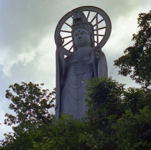 | ■ 札所二十七番 竜河山 大淵寺 (りゅうがさん だいえんじ) 【物語】 宝明(ほうめい)という名の行脚僧が、ここ影森の地で病に倒れ、7年の間病床にあった。そこへ訪れた弘法大師は、宝明から病の話を聞くと、聖観音像を彫り与えた。宝明は病の回復を祈願し、礼拝を続けた。するとどうした事か、7日目に霊験があり病は跡形もなく完治してしまった。これに歓喜した宝明は、弘法大師の彫った観音像を本尊として、堂宇を建立したという。 【記事】 毎年4月には護国大観音縁日が催され、平和祈願が行われている。 高さ15メートルもある護国大観音は、高崎観音・大船観音と共に関東三観音の一つに数えられている。平成8年に「月影堂」(観音堂)が再建される。 【ひと言】 境内から見上げる大観音像は、やさしい顔で参拝者を見守ってくれている。 山々の木々に囲まれた風景の中から、一光が差すようなかたちで大観音像を眺める、というのもまた良いものである。 【御詠歌】夏山やしげきが下の露までも心へだてぬ月の影もり 【所在地】 〒369-1872 埼玉県秩父市上影森411 【電話番号】 0494-22-5259 出典:CANON ELECTONICS INC編纂より |