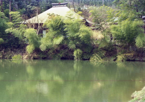 昭和60年4月10日秩父三十四ヶ所 4回目巡拝 19番・竜石寺〜20番・岩上堂〜21番・観音寺〜22番・栄福寺〜23番・音楽寺〜24番・法泉寺とまわり今日最後の25番・久昌寺。 門前で無人野菜販売がある。並べられた新鮮な椎茸@200円2袋傍らの料金箱に代金を入れ土産にする。 観音堂を映した弁天池、対岸に本坊納経所はある。 |