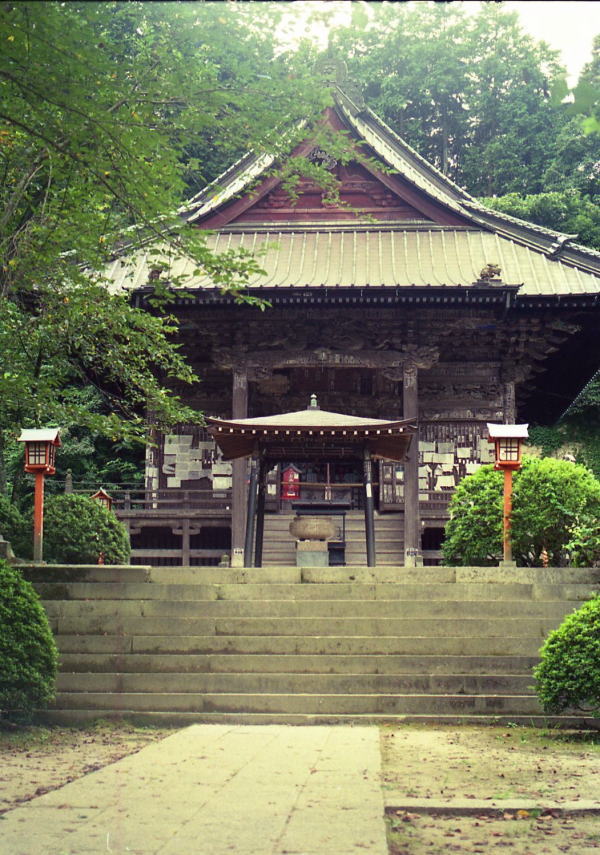 正面の石段を上ると、愚禅和尚の筆になる「施無畏」 の扁額をかける仁王門、さらに登りつめると、岩壁に囲まれた五百坪はどの境内に観音堂が建っている。その右手の鐘楼には松山合戦の折、兵の士気を鼓舞するため陣中を引きずったのでキズ跡を残す元享二年(一三二二)在銘の梵鐘がある。昔は六十六ヵ坊を擁し、関東に並びなき大伽藍を構えていたというが、今は堂塔の数は少ない。だが木立ちを吹き抜けてくる風がすがすがしく、巡礼者を山寺の法悦にひたらせてくれる。